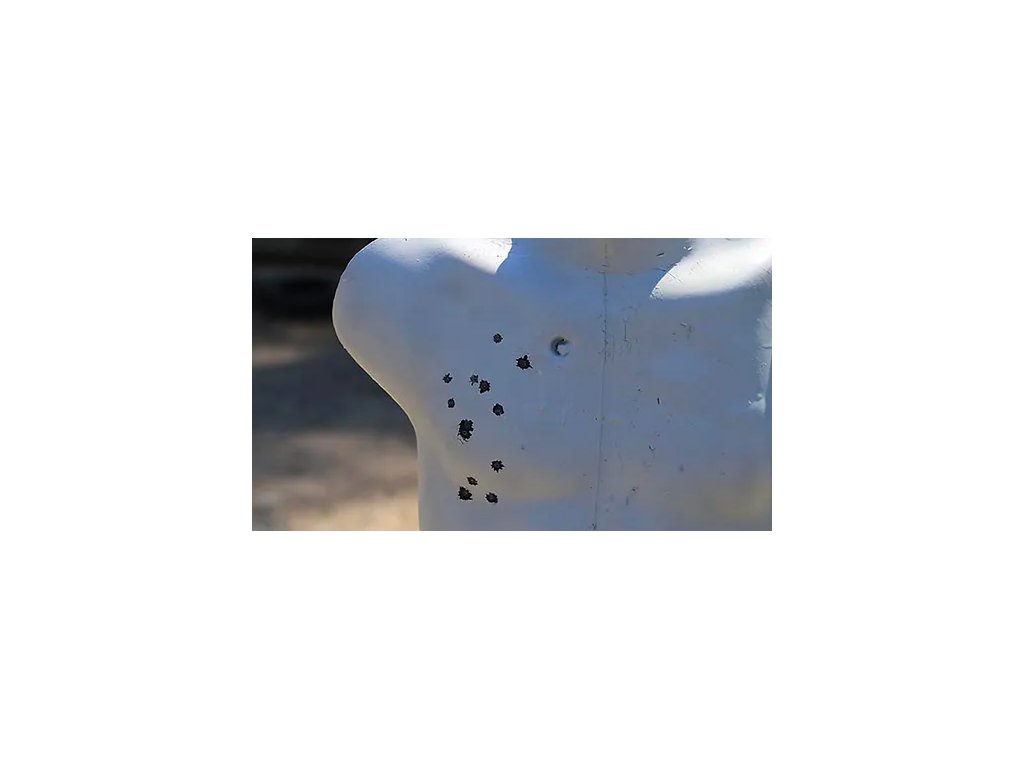 Žádná střela z testovaného množství nezdeformovala terč z přední strany tak, že by v něm byly viditelné otvory