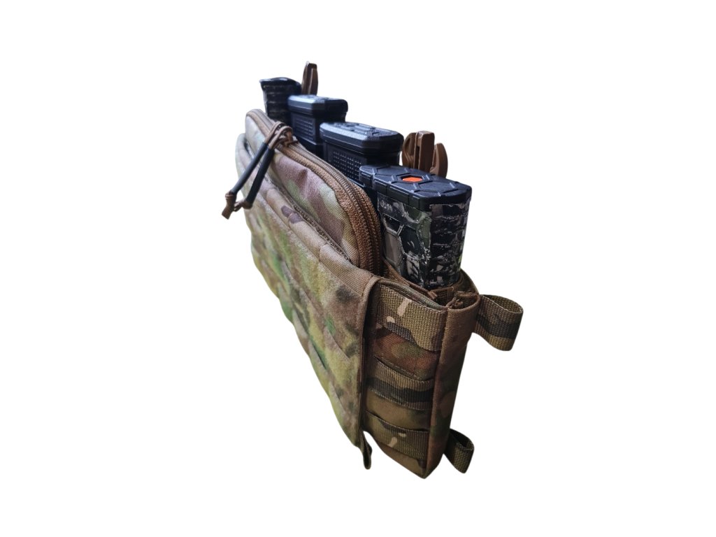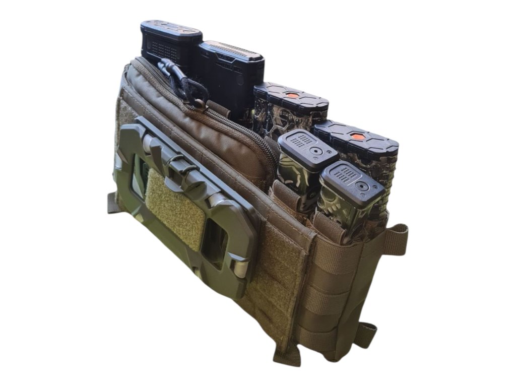 📂 Insert se vkládá do vnitřní části chest rigu, kde stabilně drží a nijak neomezuje manipulaci s výstrojí. Horní zip po celé délce umožňuje rychlý přístup k obsahu i v rukavicích.
